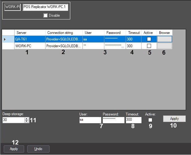 - The Connection string column (2) displays the string of connection to remote database server. The string is generated automatically. The name of the SQL server is made from the Server name to which \sqlexpress is added. The default name of database is POS. If it is necessary to change the connection strings, do the following: