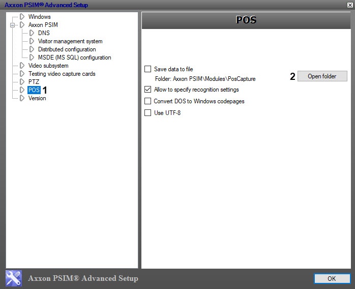 To view log files, open the <POS PSIM program folder>\Modules\PosCapture folder in Windows, or click the Open folder (2) button in the tweaki.exe utility window in the POS tab (1).