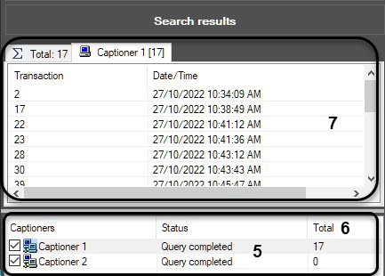 The search process stops when all selected captioners are processed, i.e. the Status column has the Query completed status for all selected captioners (5). The number of found records for each captioner will be displayed in the Total column (6) of the captioner status table. The list of all found transactions will be displayed in the search results table (7).