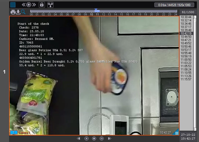 The video fragment corresponding to the selected transaction will be displayed in the video search results area (1).