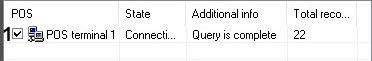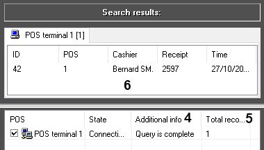 The search process stops when all selected POS terminals are processed, i.e. the Additional info column (4) displays the Query is complete state for all selected POS terminals. The number of found records for each POS terminal will be displayed in the Total records column (5) of the POS terminal status table. The list of all found transactions will be displayed in the search results table (6).