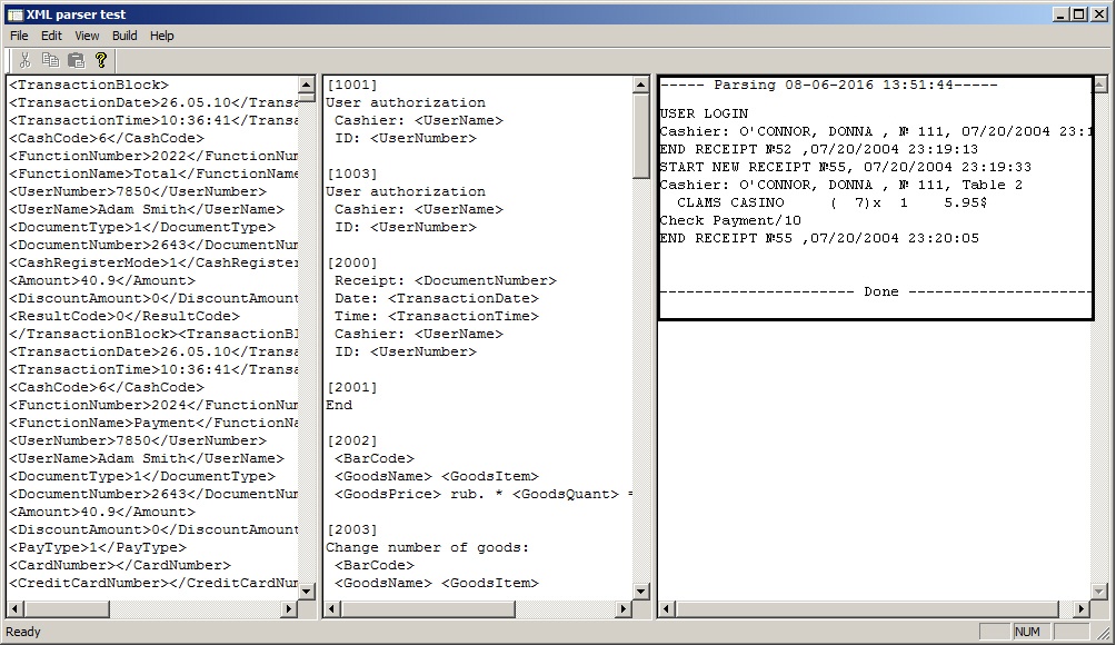 XML-log received from the POS is loaded to the first window. Logs are saving in the <Axxon PSIM software installation directory>\Modules\PosCapture folder. Name of log file is pos_N.log, where N is the number of POS-terminal corresponding to POS from which log was received.