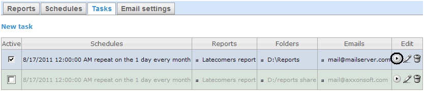 - Reports specified in the task will be generated and saved in the folders and/or sent to the e-mail addresses. If it is not happening one should check whether the actions with reports are set up correctly (see Creating the task section).