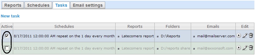 - In the Active column set the checkboxes checked for the tasks that should be run and unchecked for the tasks that should be stopped.