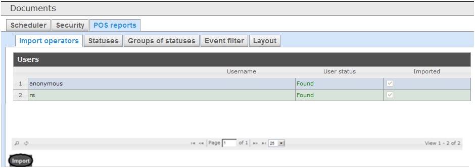 The list of POS operators is empty by default. In order to fill it in it is necessary to import users from the general list of Intellect Web Report System users.