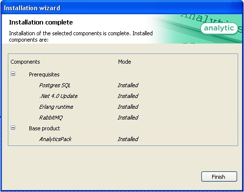 Then the installation wizard box is displayed, containing the information on the mode (installed or not) of Analytics Pack components. - Click the Finish button.