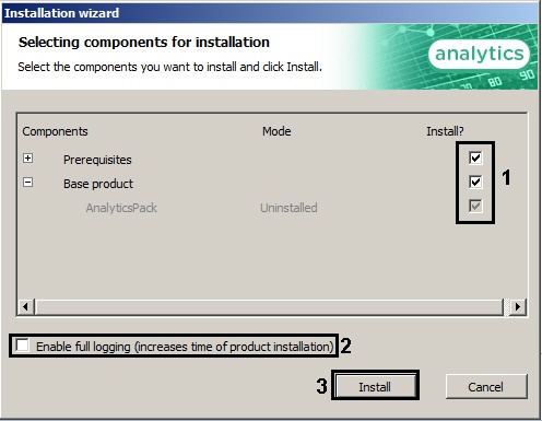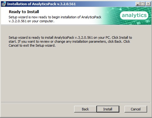 - In the Ready to install dialog window run the process of Analytics Pack installation. To run the installation process click the Install button.