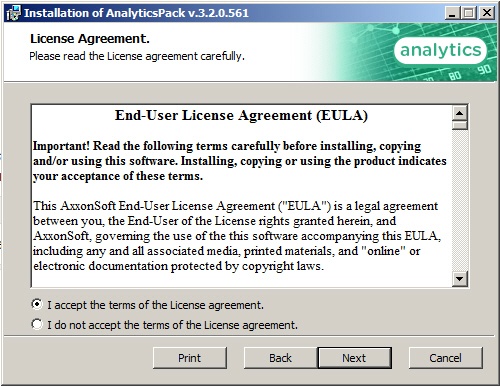 The dialog window with license agreement is displayed. - In the next dialog window accept or decline the terms of the License agreement about using of Analytics Pack technology. Set the I accept the terms of the License agreement checkbox and click the Next button. To print the agreement click the Print button.