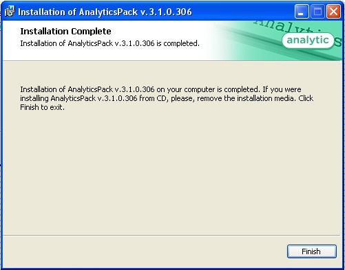 Wait for the completion of copying files and next updating of installation box. - Message that Analytics Pack installation on the hardware is finished is displayed in a new dialog box.