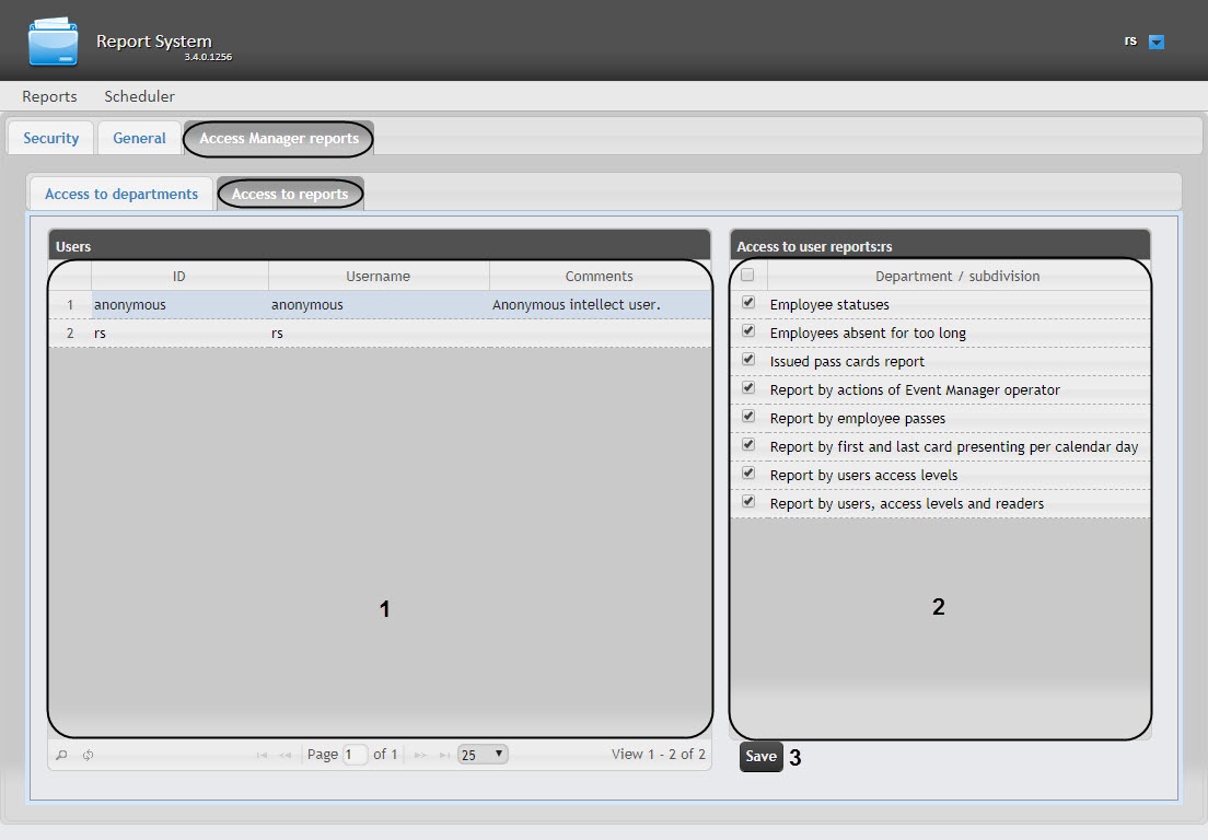 The list of available reports for the selected user is displayed in the Access to reports of user table (2).