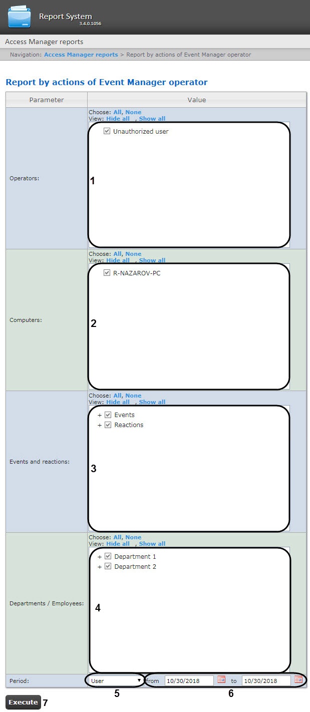 - Select the Report by actions of Event Manager operator (see Selecting the type of Access Manager report). As a result the dialog box for specifying the report parameters will be displayed.
