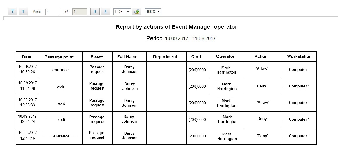 The Report by actions of Event Manager operator is a table which displays the requests received by the Event Manager operator and his reactions to them.