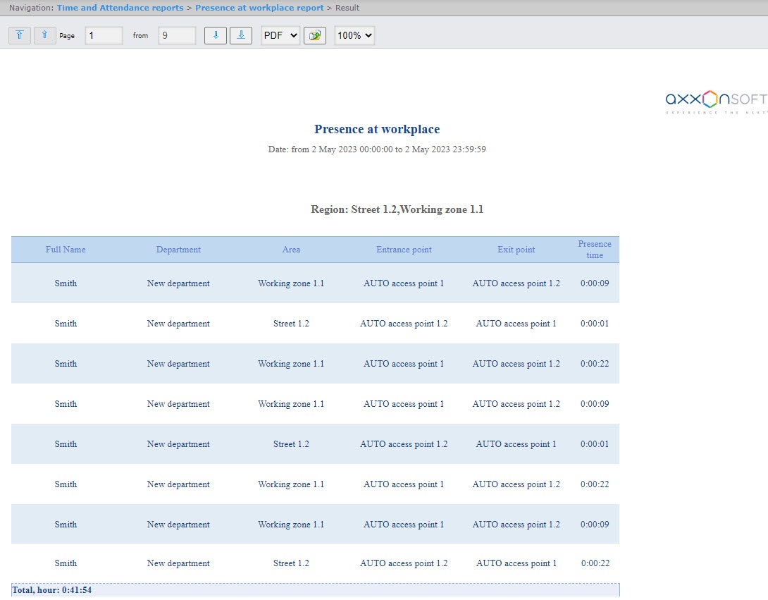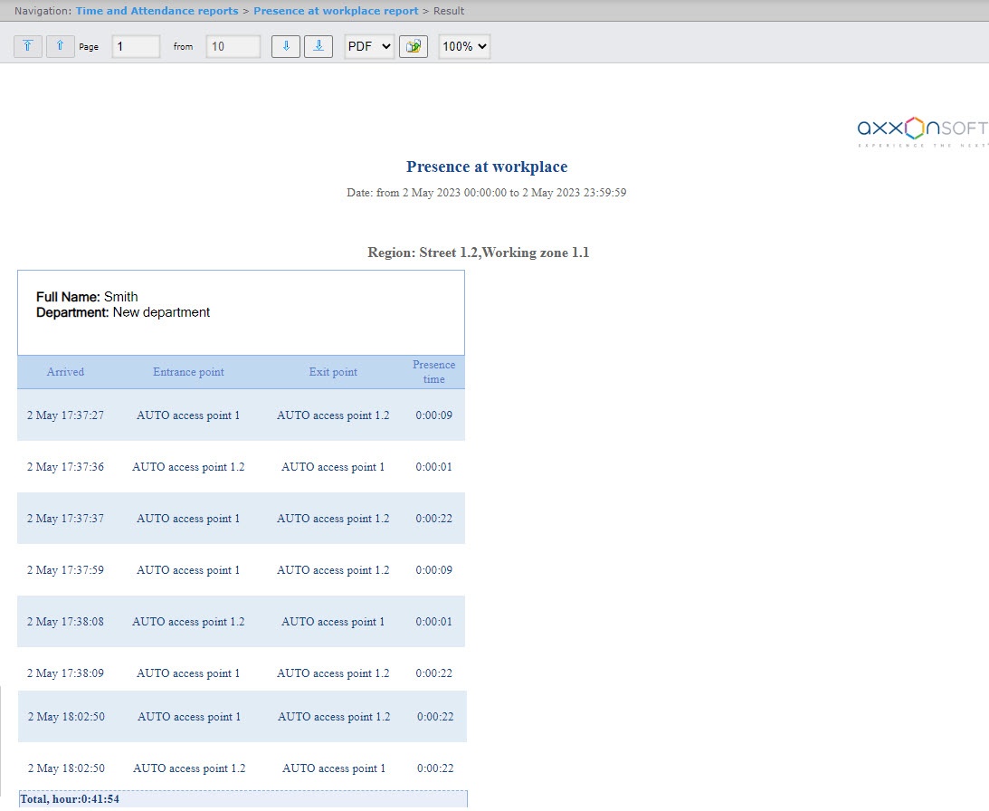 The Presence at workplace report contains the information about the times when the employee left the selected region during the day, and how much time the employee spent in the selected region within the specified time period.