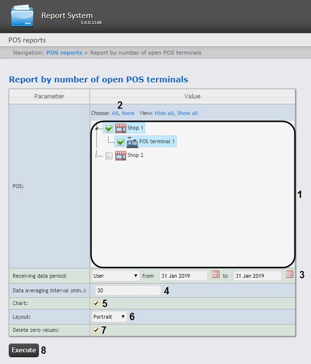 - Set the Delete zero values checkbox in order not to display the open POS terminals in the report if their number equals zero (7).
