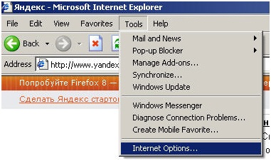 - Execute the Tools –> Internet options command in main menu of Internet Explorer browser.