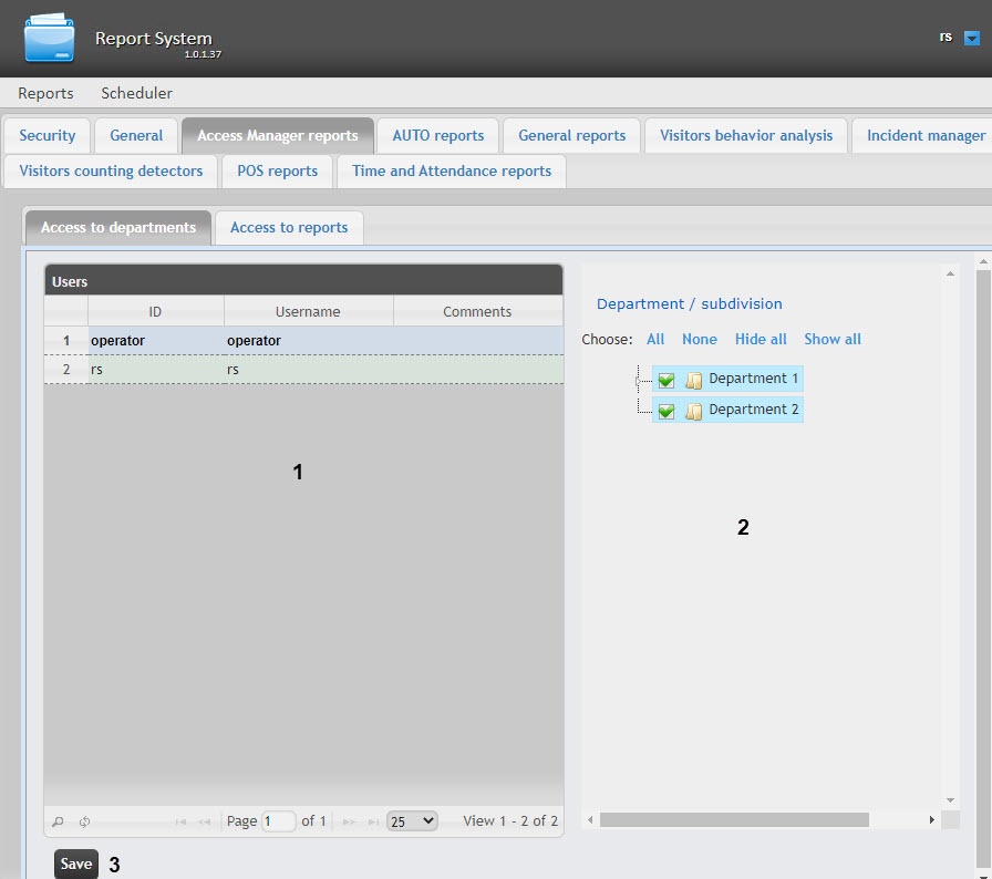 The list of available departments for the selected user is displayed in the Access to departments table (2).