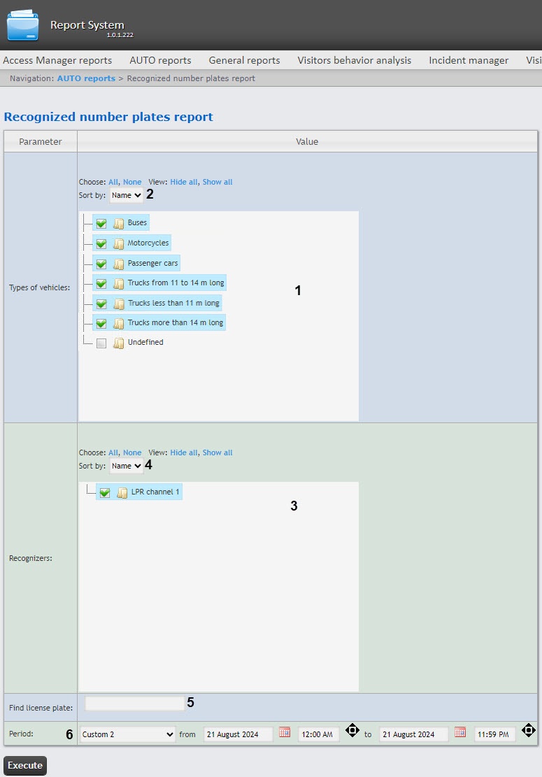 To create the Recognized number plates report, select it from the Auto reports (see Selecting the type of Auto report) and specify the report parameters in the form that opens.