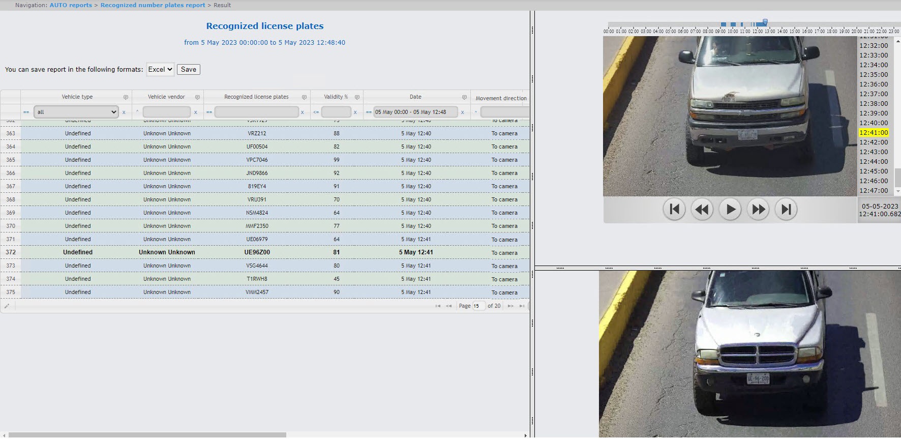 The report table contains the vehicle type, vehicle make, recognized LP number, recognition accuracy as a percentage, date of recognition, direction of movement, recognizer, vehicle speed (km/h), operator's comment. When you click a row in the table, a screenshot from a camera is displayed in the lower right corner of the report and, if there is access to the video archive, the video is played in the upper right corner of the report.