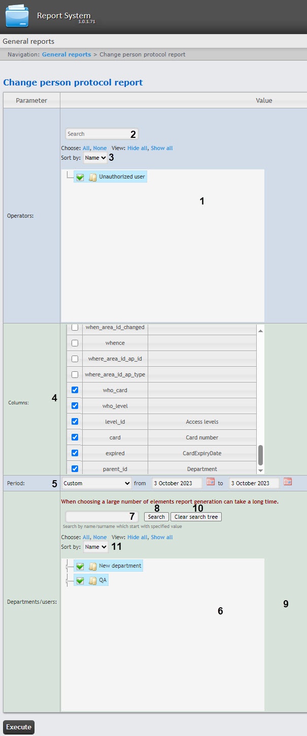 To create this report, select the Change person protocol report from the list of General reports (see Selecting the type of general report). Specify report parameters in the form that opens.