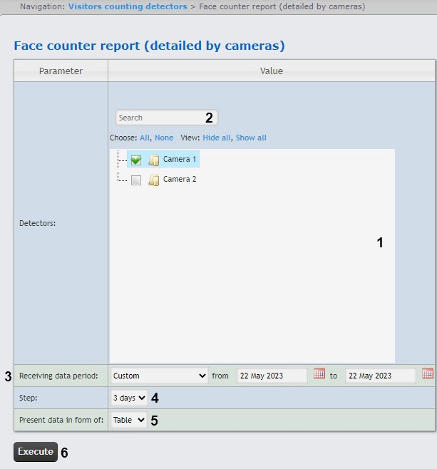 The Face counter report (detailed by cameras) allows getting data on the number of the captured faces (people) using the data from the video cameras. The data can be presented as a table and as a graph.