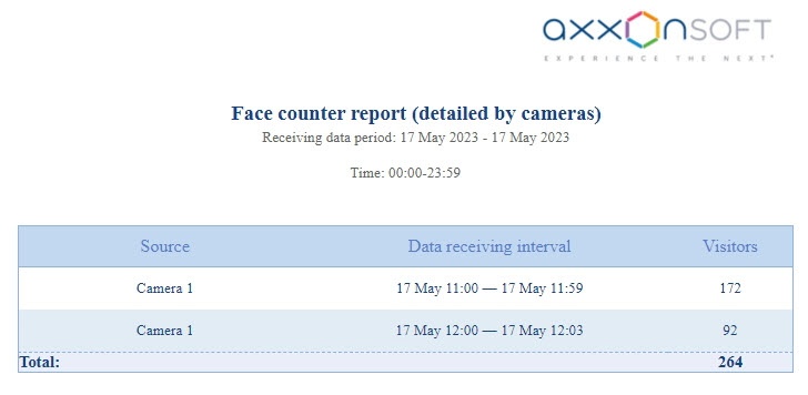Example of the Face counter report (detailed by cameras) in the form of a table: