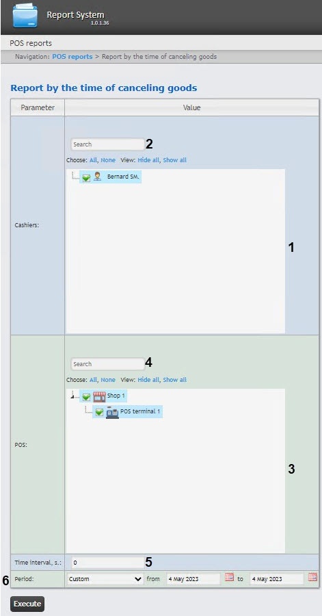 1. Select the Report by the time of canceling goods (see Selecting a type of general POS report).