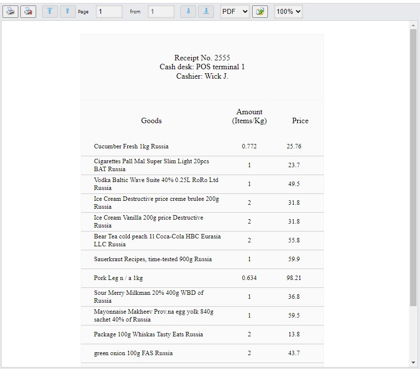 • Receipt contents (2) − opens a window for printing only the list of items in the receipt.