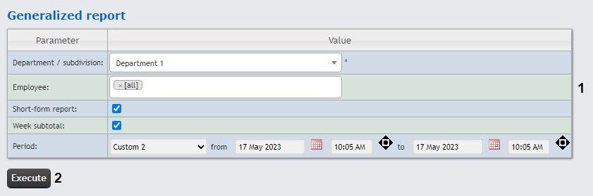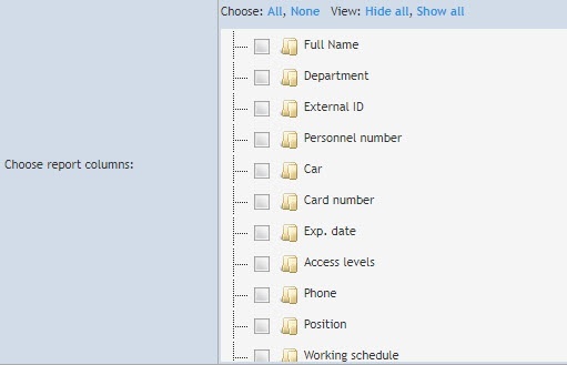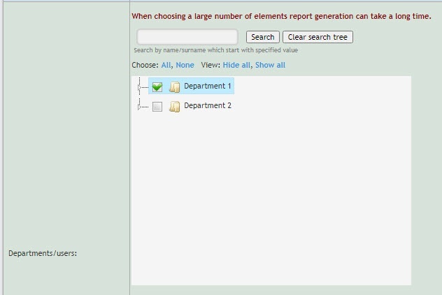 Used to select a department or an employee the information on which you want to display in the report. The structure of the departments in the reports corresponds to the structure of the departments in the Time and Attendance module. You can select all departments at once, or separately parent and child departments, as well as several employees of a department