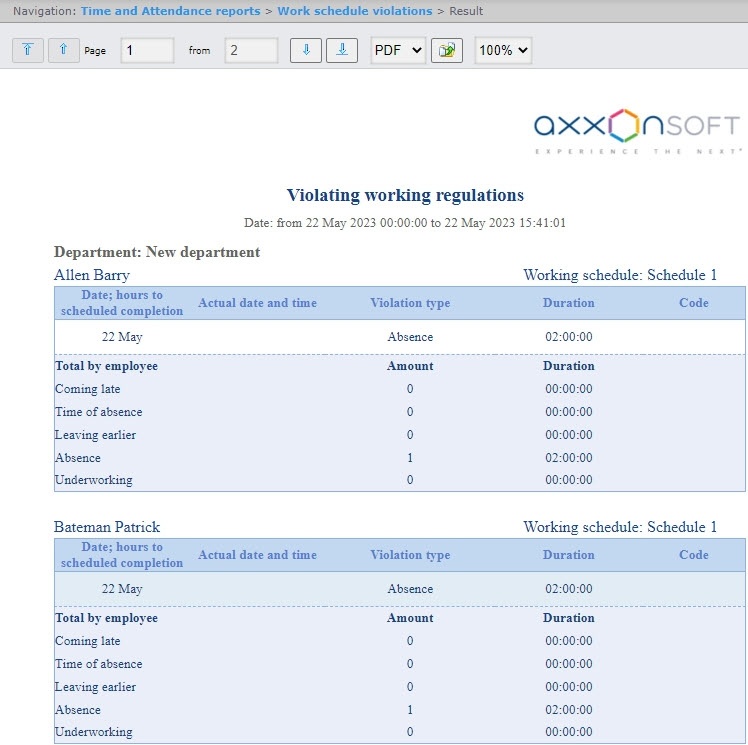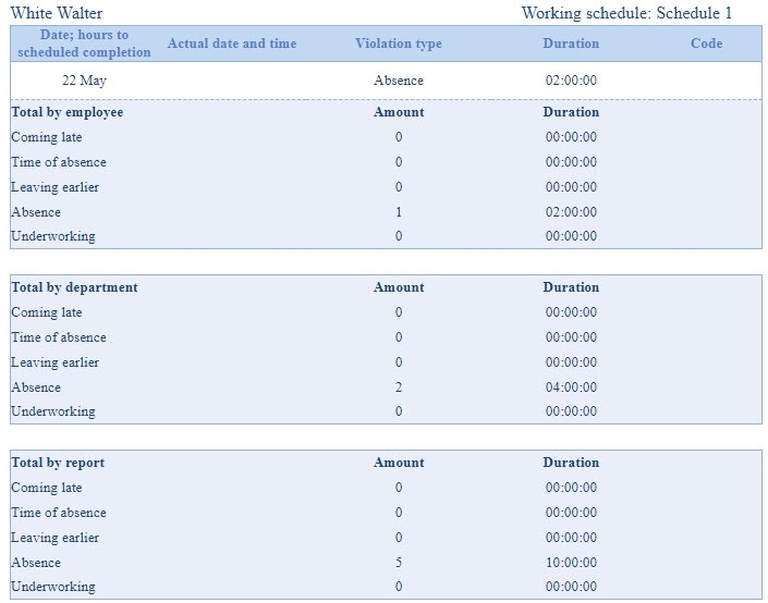 A Work schedule violations report contains the information about the employees that violated the work schedule in the specified time period, the violation type and its duration.