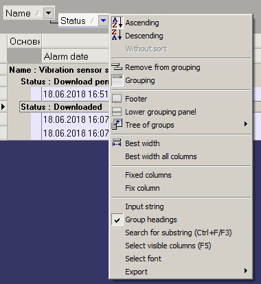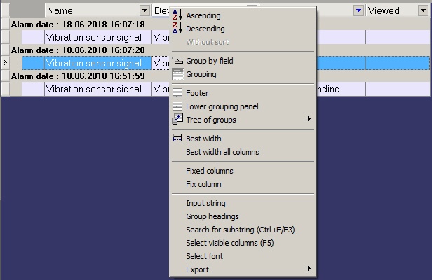 By default, video data are grouped by alarm time. If necessary, it is possible to set video data grouping by other parameters. To do so, in the context menu of a column, by which one need to group the data, select Group by field.