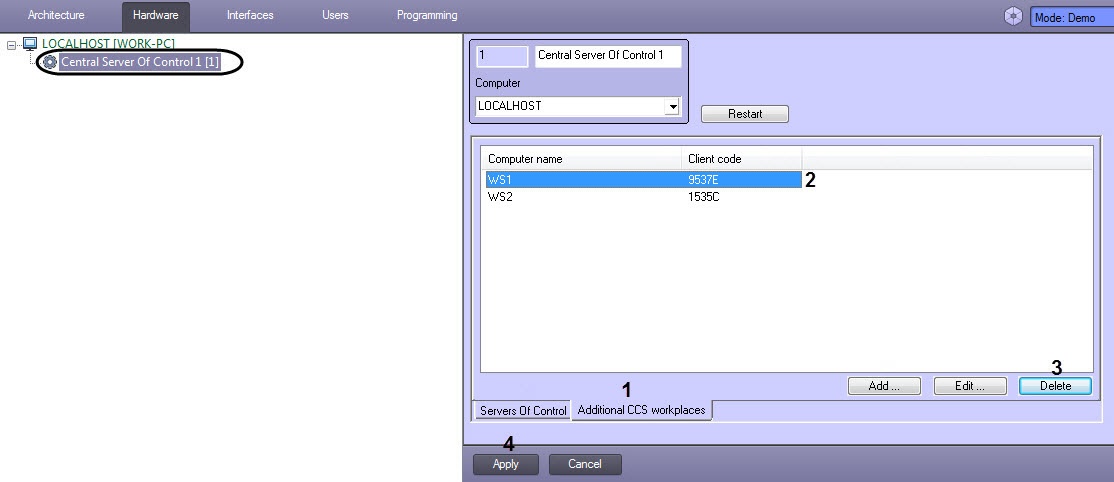 - On the Additional CSC workplaces tab (1), select the Additional workplace of CSC which should be deleted (2), and click the Delete button (3).