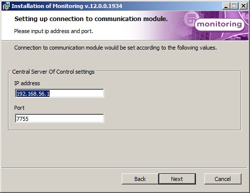 Specify IP-address and port for connection to Central Server of Control communication module CentralNetServer. Click Next.
