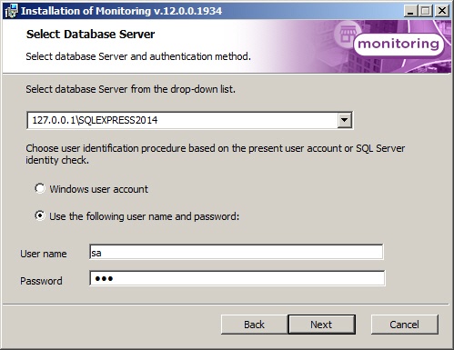 Select the database MS SQL Server and specify the authorization parameters for connection. For details, see Installation of INTELLECT™ software as a Server/Remote administrator workplace. To continue the installation process, click Next.