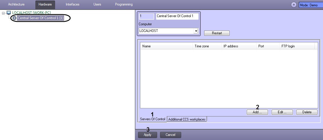 - In the IP address field (3), specify the IP address of the Server of Control.