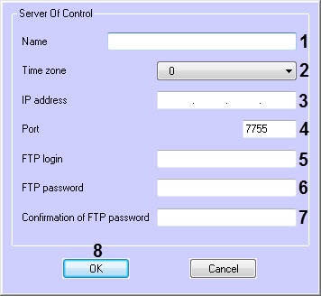 - In the FTP login field (5), enter the user name with administrator rights to connect to the FTP Server. This server will be used for exchanging the data between the Central Server of Control and the Server of Control (see Configuring the FTP server for the Central Server of Control operation).