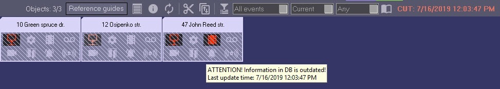 - On the Server Of Control, all objects will be covered with diagonal lines. When you hover over such an object, a contextual prompt will appear: ATTENTION! Information in DB is outdated! Last update time: <Date and Time of the last upload to the database>. The CUT will flash red (see Current Update Time).