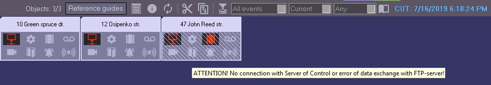If there is no connection between the Central Server Of Control and the Server Of Control, or if there is a problem in data exchanging with the FTP server (for example, an incorrect password), then only those objects that belong to the Servers Of Control with this problem will be covered with diagonal lines. When you hover over such an object, a contextual prompt will appear: ATTENTION! No connection with Server Of Control or error of data exchange with FTP server! The CUT will remain blue and will not flash.