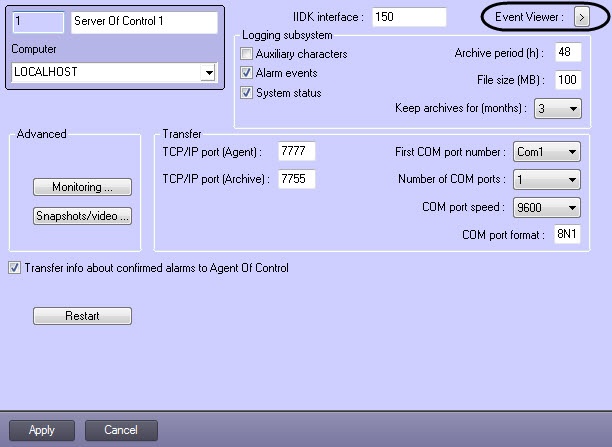To start the Event Viewer utility, click the Event Viewer button on the Server of Control settings panel.