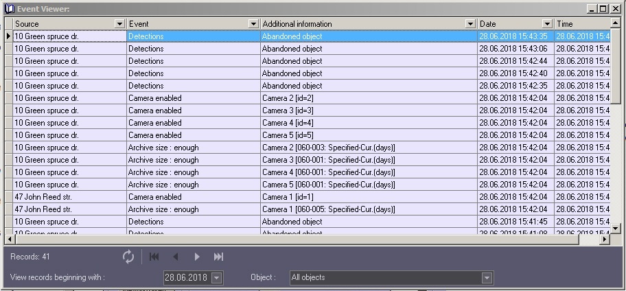 The disadvantage of viewing information via the Event Viewer is clearing the screen on each Intellect restart. It is impossible to see what was on before the system restart. The additional Event Viewer utility is required in such cases. This utility operates the database directly and allows to view information from the whole length of time used to keep the event log in the database.