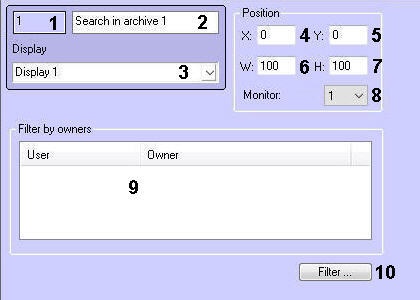 4 | X: | Enter the value in the field | Set the X coordinate in the horizontal axis for the upper-left corner of the Search in archive interface box | % of the screen width | 0 | From 0 to 100. When more than one monitor is connected to the computer it is possible to use coordinates outside this range, but it is not recommended to use coordinates less than -200. |