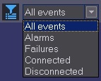 (Turn filter on/off). The first drop-down list defines condition for filtering by alarms, failures, presence or absence of connection; the second drop-down list defines the condition Show only objects with errors for last...; and the third one defines the condition Show only objects with errors lasting longer than...