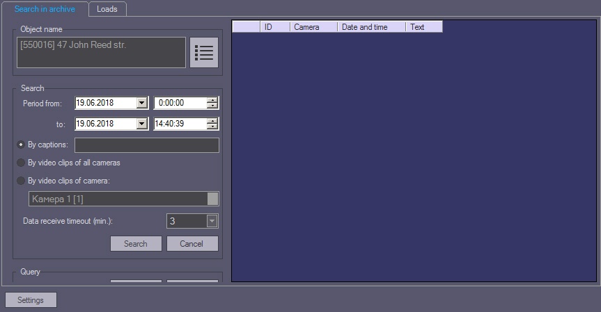 When a display used to create the Search in archive object is selected in Intellect, the Search in archive interface window is visualized.